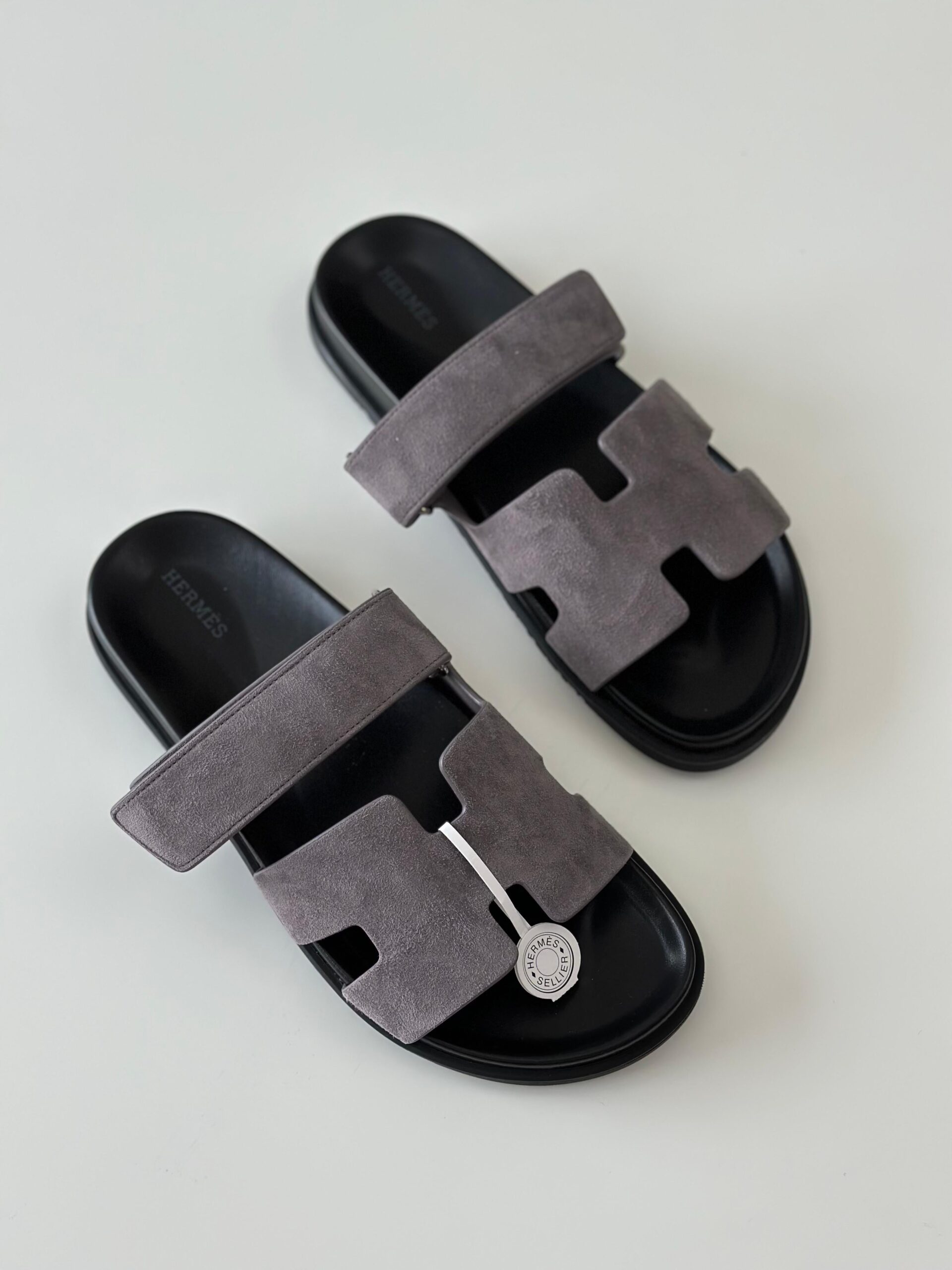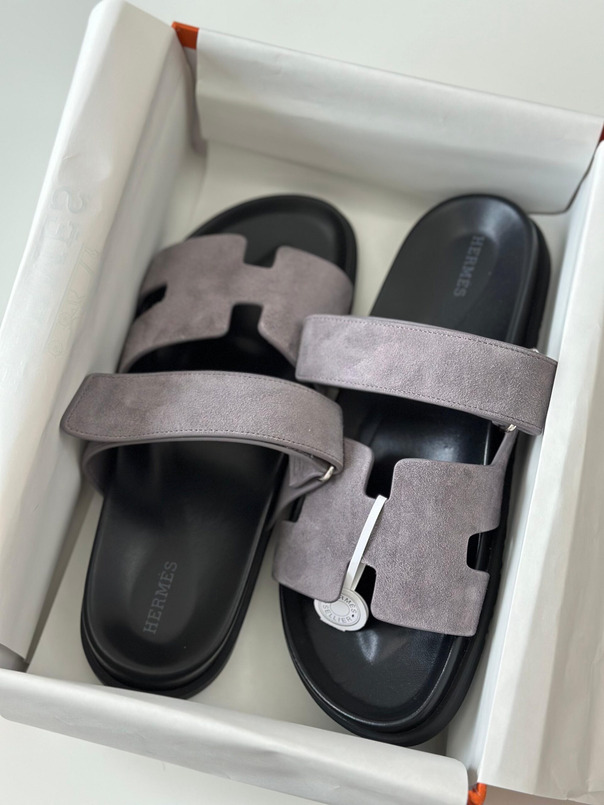 Refined and contemporary, the Hermès Chypre Sandal in Light Grey blends elevated comfort with sleek design. This variant, prominent in the Mainland China collection, features soft calfskin in a cool grey hue and comes equipped with an adjustable “H” strap for a tailored fit. Crafted in Italy, each pair is built on an ergonomic rubber sole (~1.2 cm thick), delivering both effortless style and a pleasantly cushioned step.